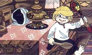 Кот с петухом на охоту ходили, а Жихарка домовничал: обед варил, стол накрывал, ложки раскладывал.